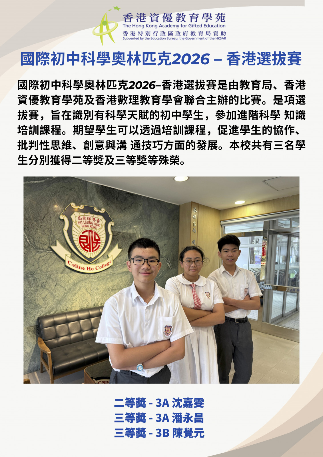 國際初中科學奧林匹克2026 (香港選拔賽) - 二等獎及三等獎