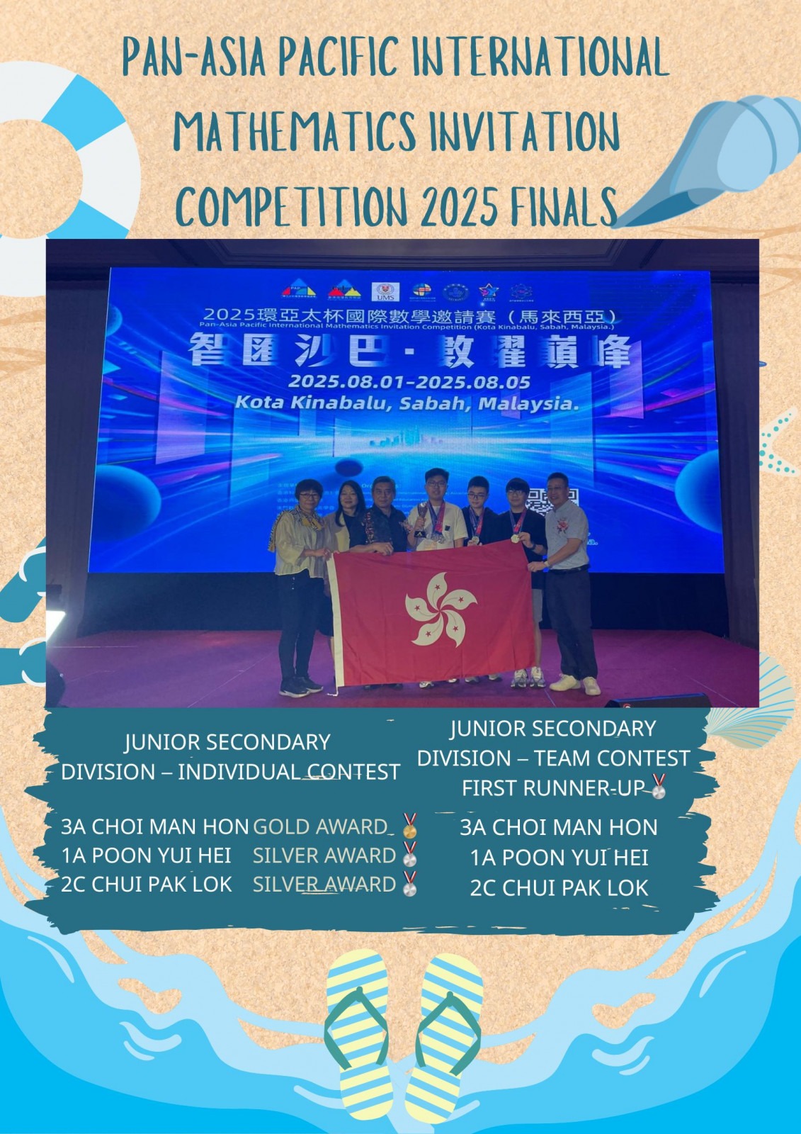 Gold and silver award (Junior Secondary Division – Individual Contest); First runner-up (Junior Secondary Division – Team Contest) in Pan-Asia Pacific International Mathematics Invitation Competition 2025 Finals