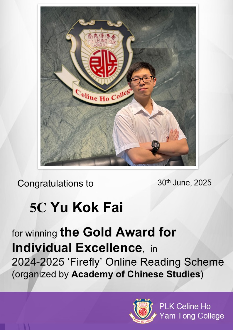 Gold Award for Individual Excellence in 2024-2025 'Firefly' Online Reading Scheme