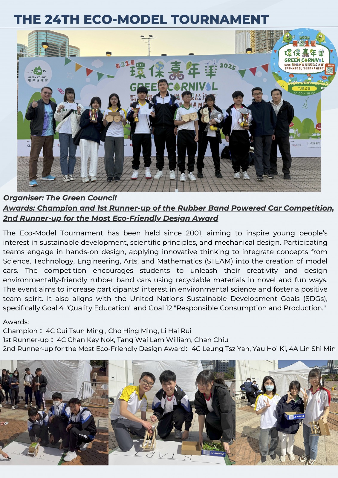Champion and 1st Runner-up of the Rubber Band Powered Car Competition, 2nd Runner-up for the Most Eco-Friendly Design Award in The 24TH ECO-MODEL Tournament