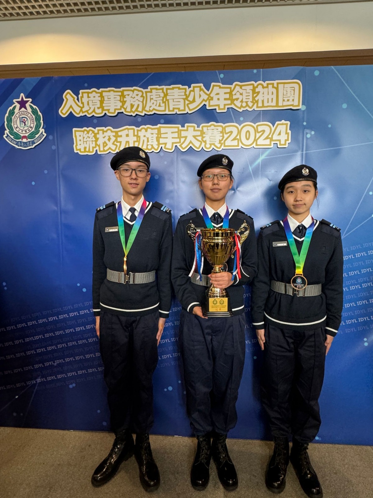 4C SO YU CHING,4C FUNG YAT HEI and 4C CHONG TSZ CHAIN won the champion in The Immigration Department Youth Leaders Corps Flag Raising Competition 2024.