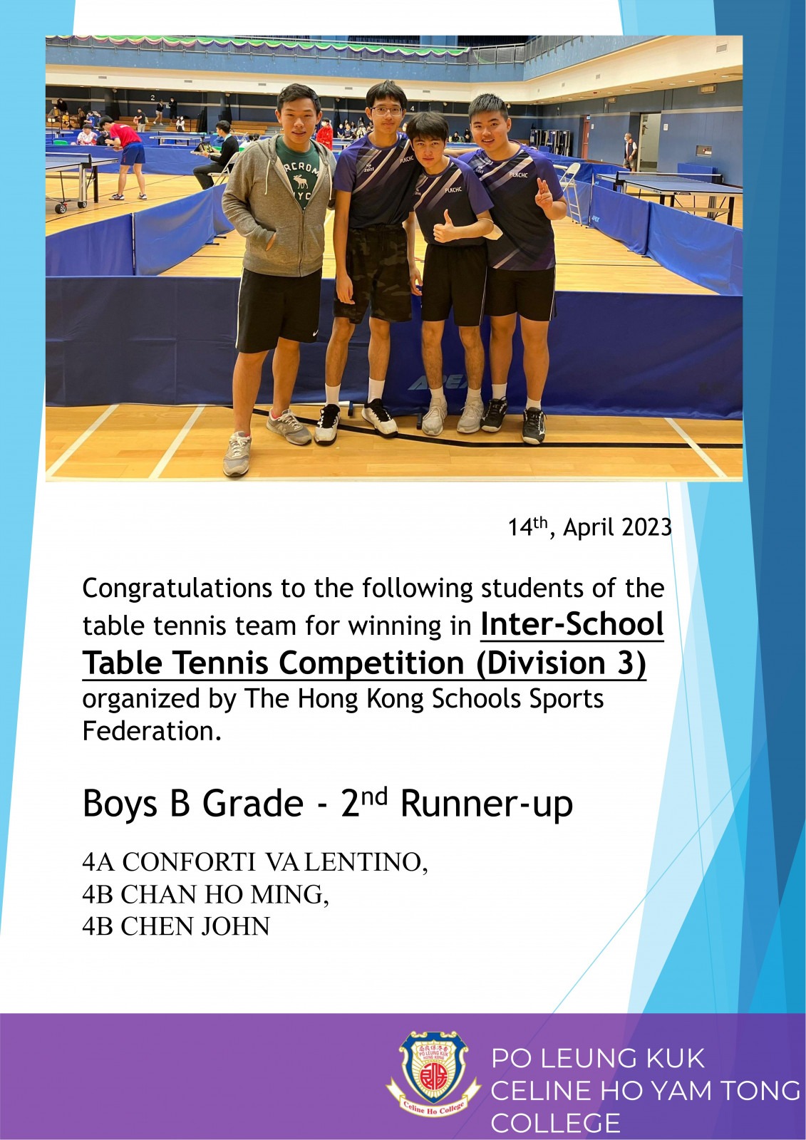 2nd Runner-up (Boys) in Inter-school Table Tennis Competition