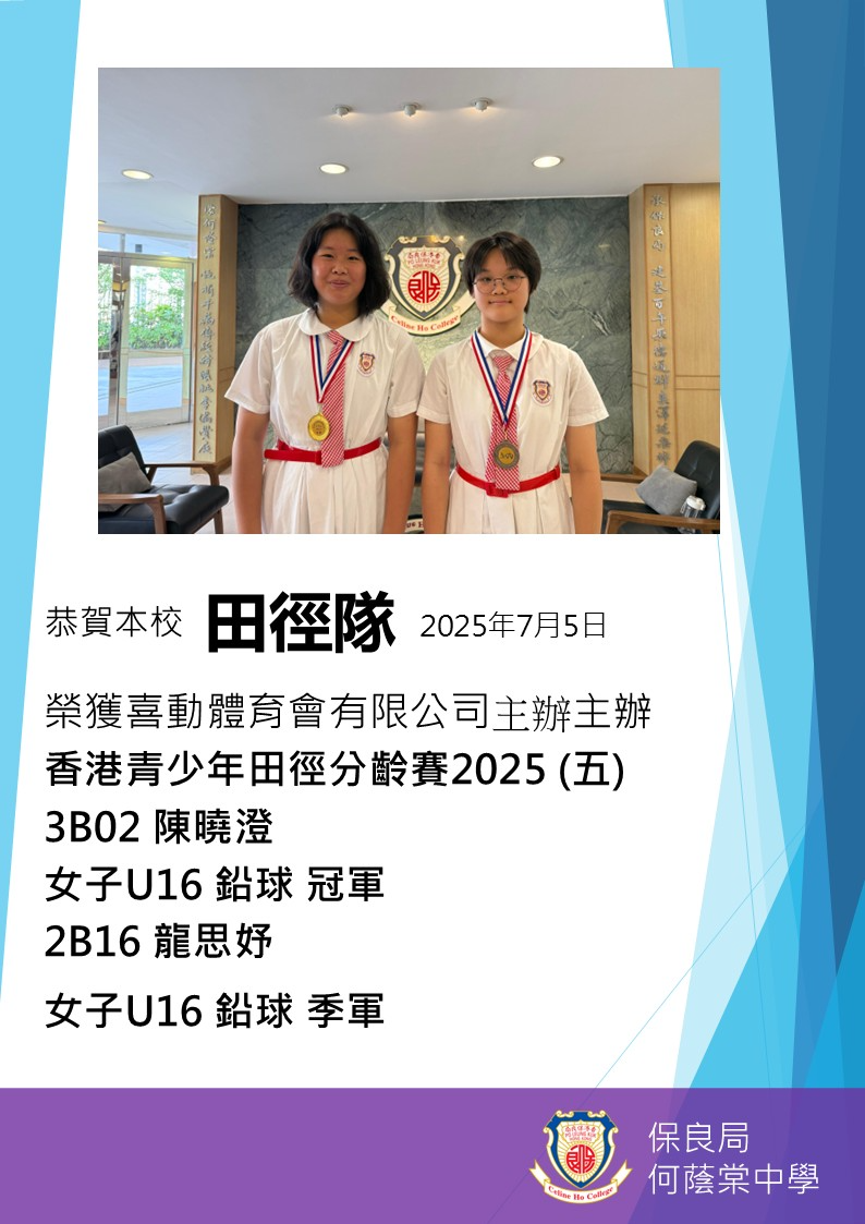 香港青少年田徑分齡賽2025(五) 女子U16鉛球 - 冠軍及季軍