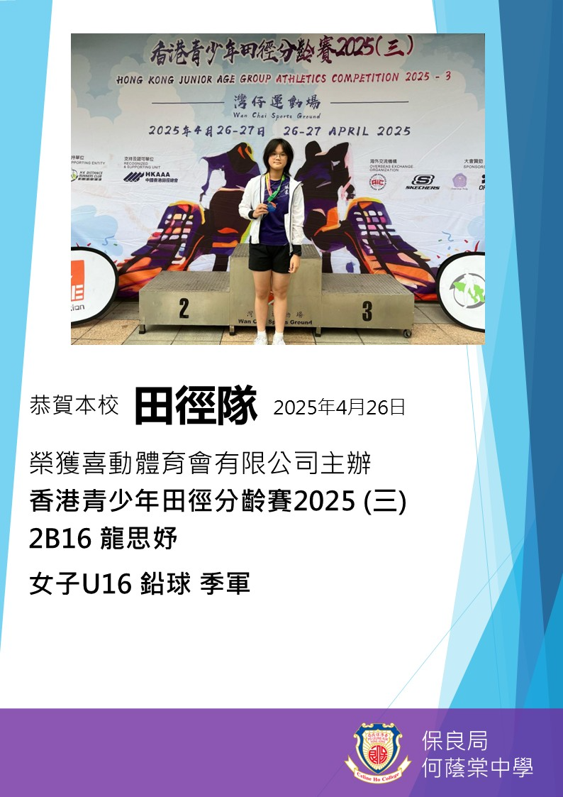 香港青少年田徑分齡賽2025(三) 女子U16鉛球 - 季軍