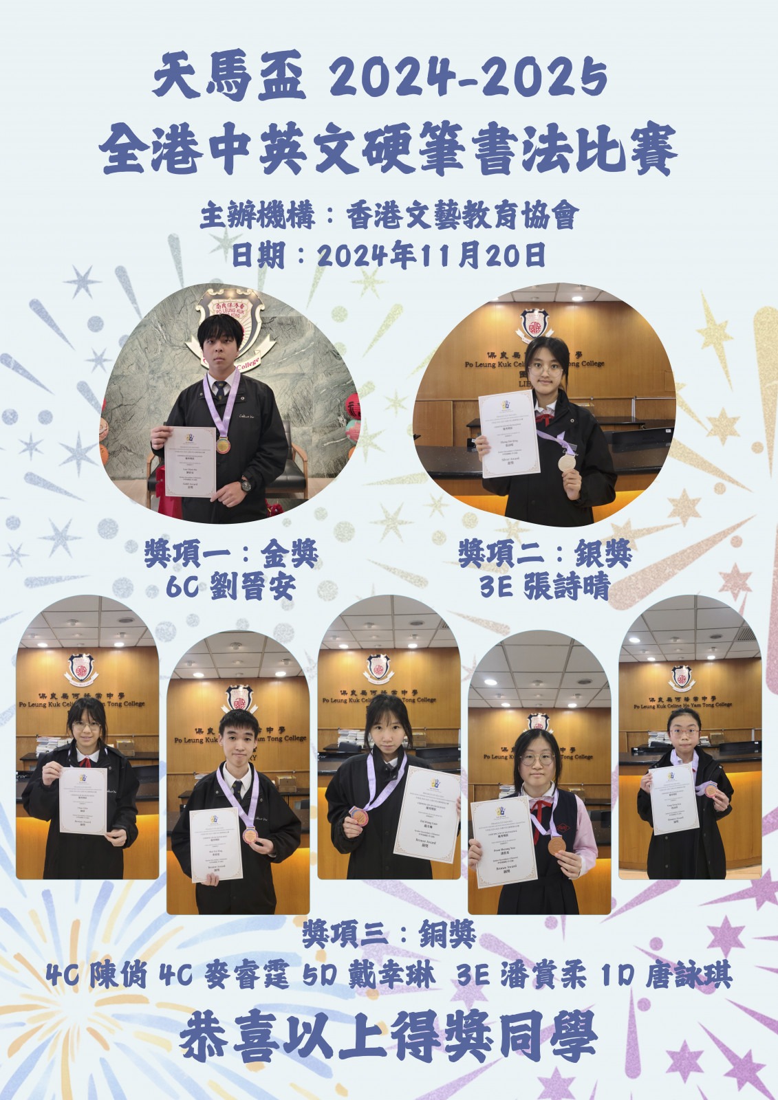 天馬盃2024-2025 全港中英文硬筆書法比賽 - 金、銀及銅獎