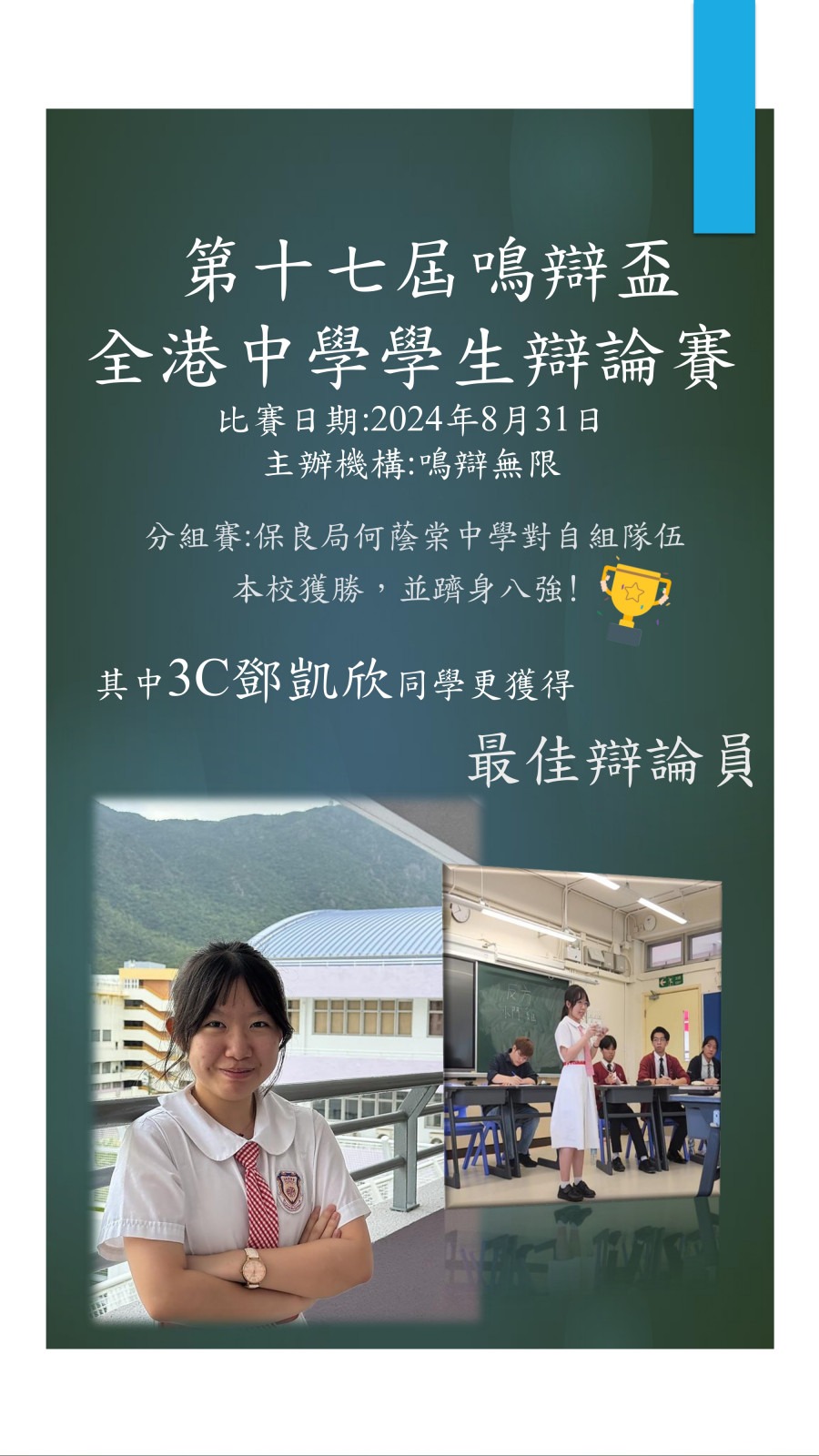 第十七屆鳴辯盃全港中學學生辯論賽 - 勝出分組賽並躋身八強及奪得最佳辯論員