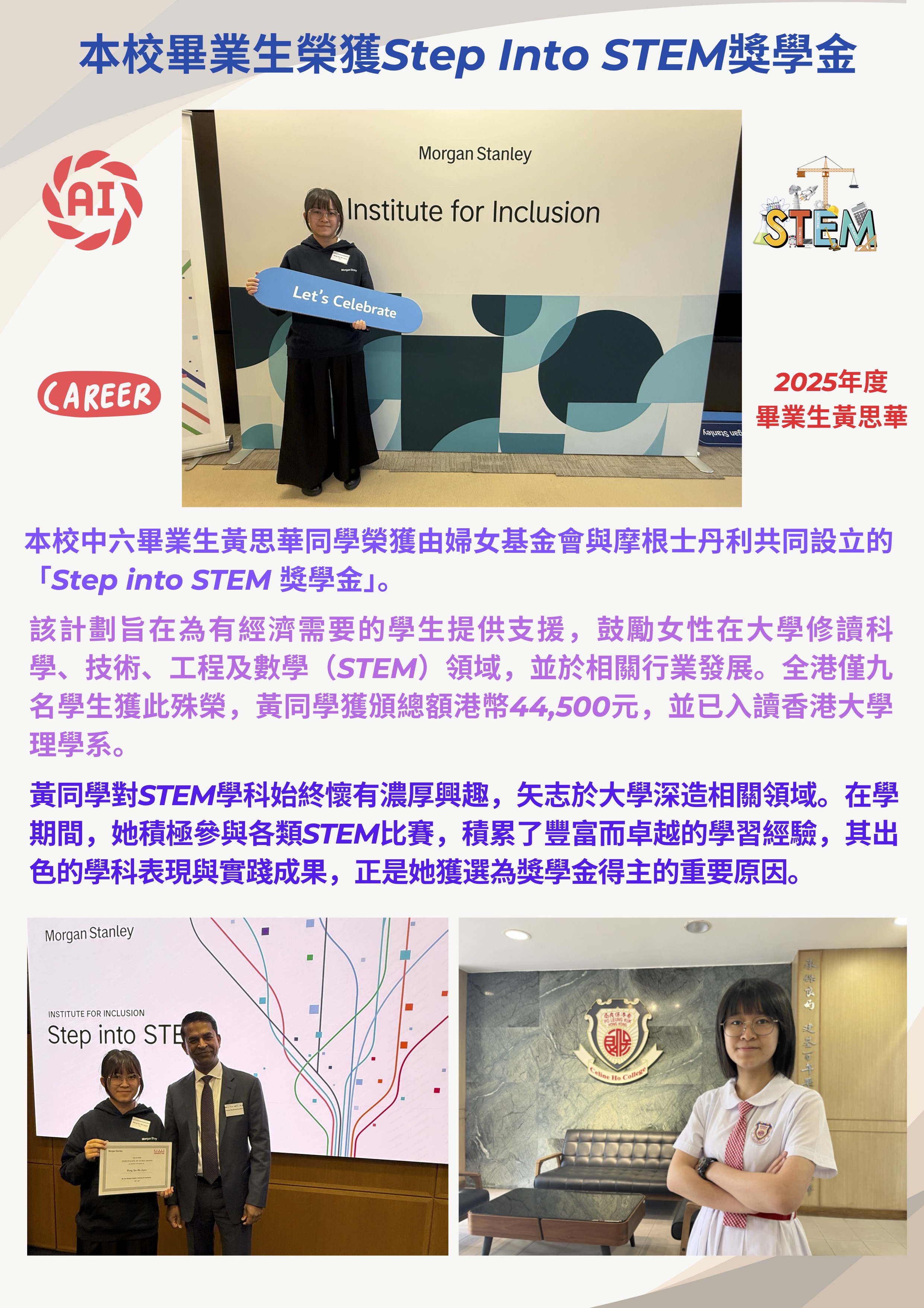 本校畢業生榮獲Step Into STEM獎學金