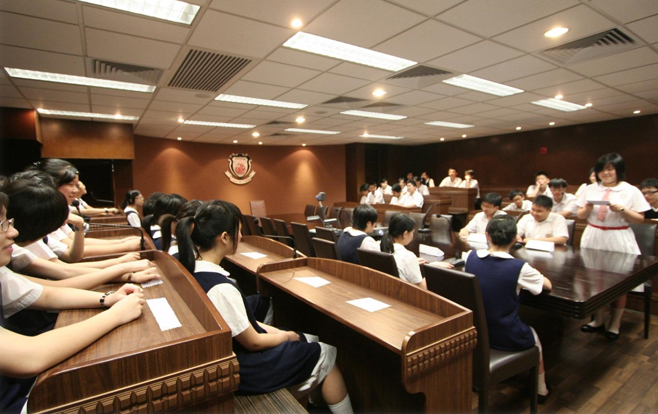 演辯廳是模擬法院的設計,室中設有電腦及無線咪系統。本校中一至中六級學生均須參與辯論比賽,因此演辯廳可供老師訓練學生的演辯及演說技巧。演辯廳不只適合中、英文科老師使用,其他科任老師亦會帶領學生到演辯進行個人短講。