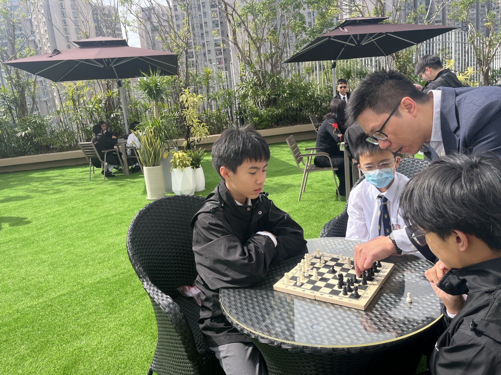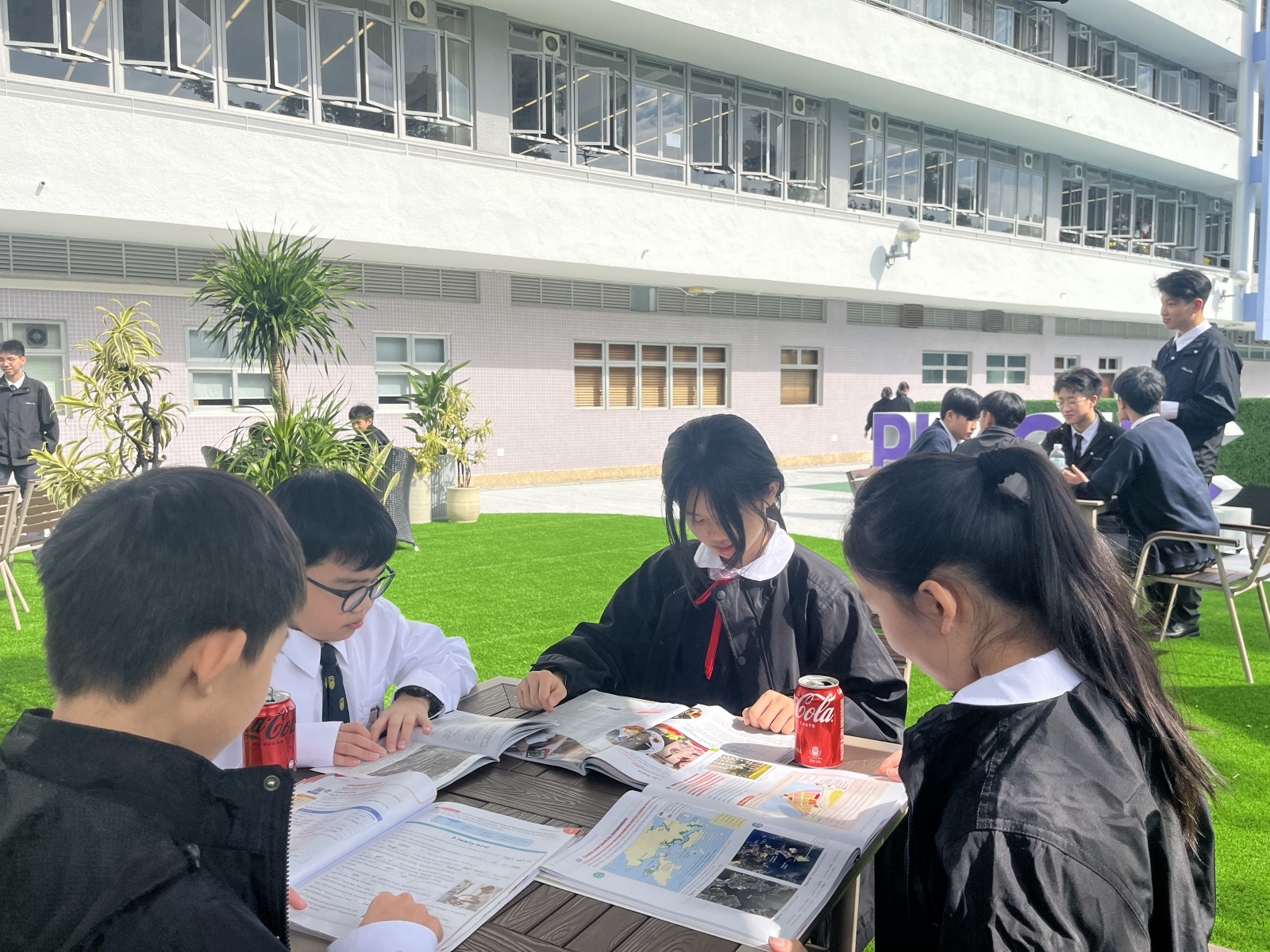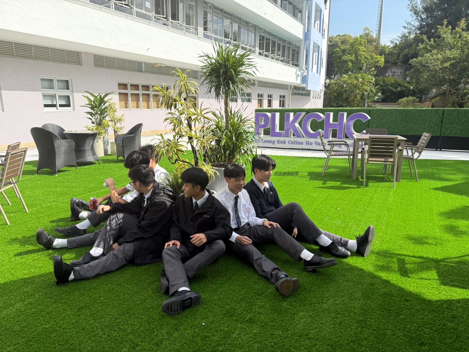 Celine Garden鋪設人工草地,設計不同組合的休憩區域,放置多張戶外桌椅、籐椅及太陽傘,為學生提供一個休憩、温習及促膝聚會的好地方。