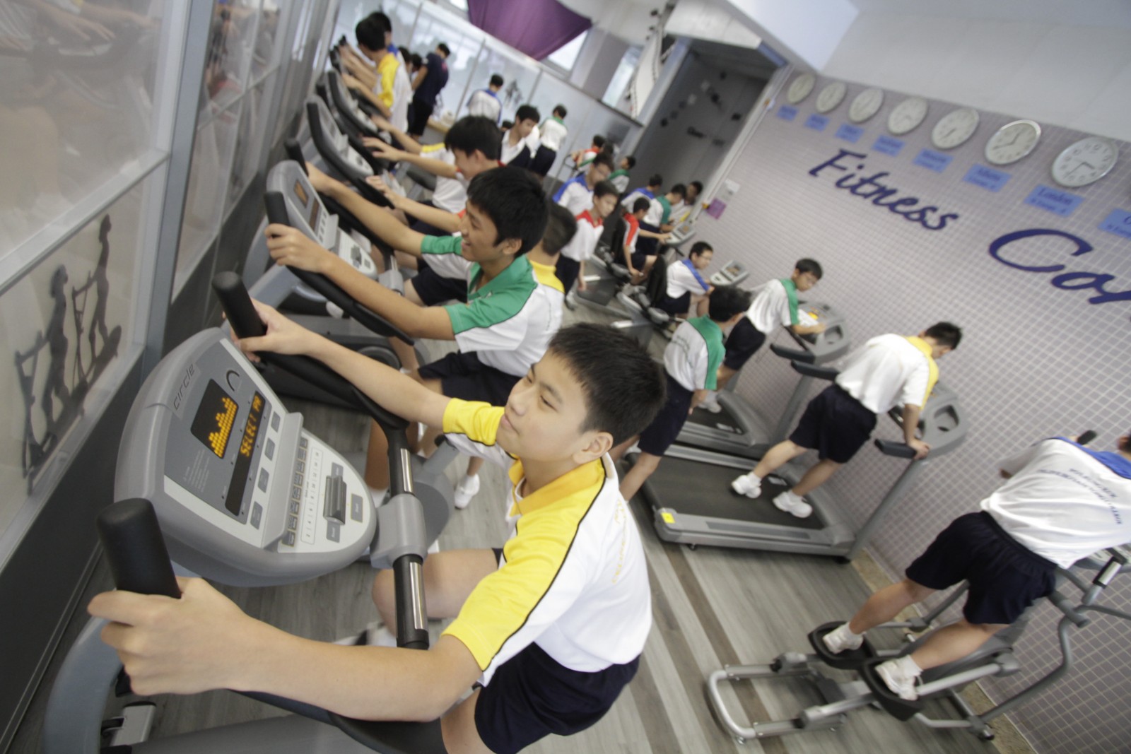 健身室的成立旨在提供多元化及專業設施,以促進同學的「體適能」發展,建立健康校園。健身室分為器械區和帶氧運動訓練區,設有超過二十五部健身器材,例如垂直提膝及引體上升、直臂夾胸機、高拉背機及多功能健身組合機等。學生可於體育課使用健身室進行定期訓練,由體育科老師紀錄學生使用各項器材時的數據,定時進行自我檢視,藉此培養學生自主學習精神。