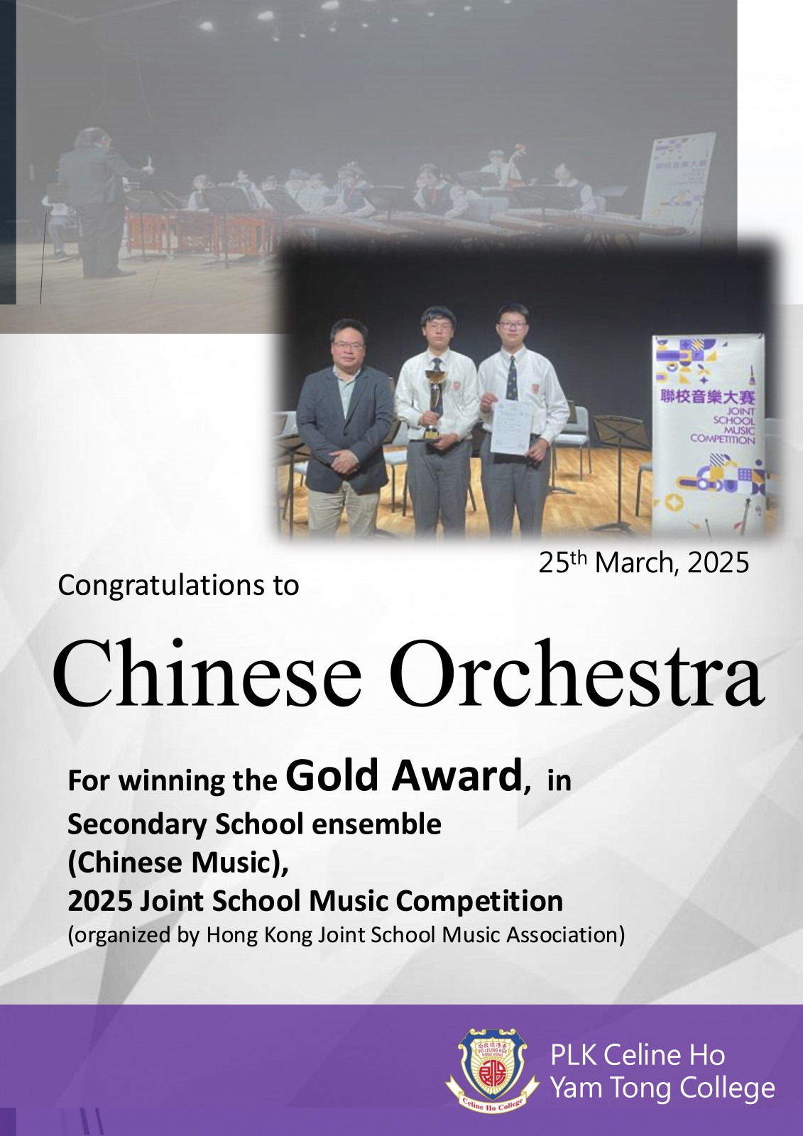 Gold Award in 2025 Joint School Music Competition: Secondary School Ensemble (Chinese Music)