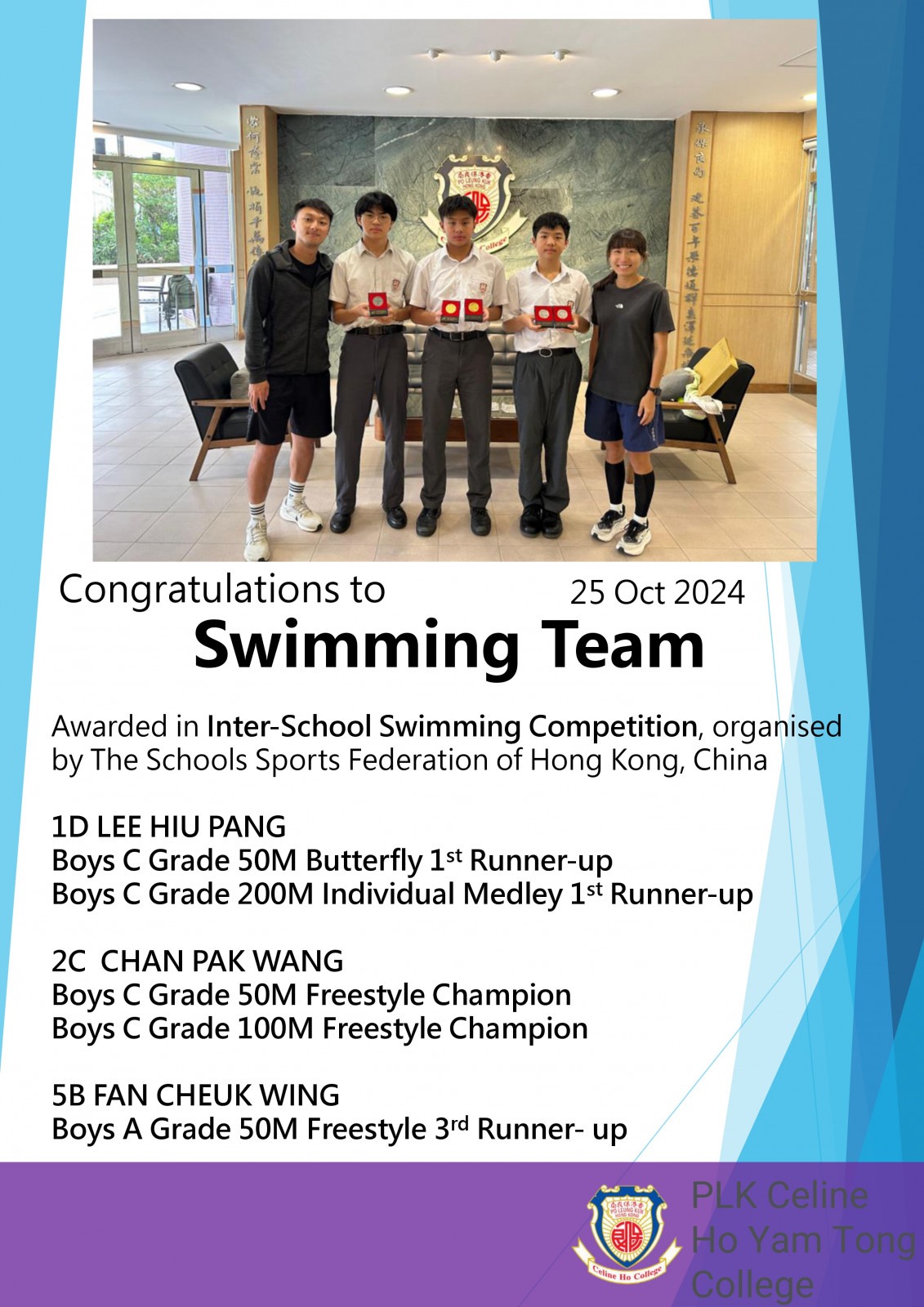 Grade A and Grade C Champion, 1st runner-up and 3rd runner-up in Inter-school Swimming Competition 2024