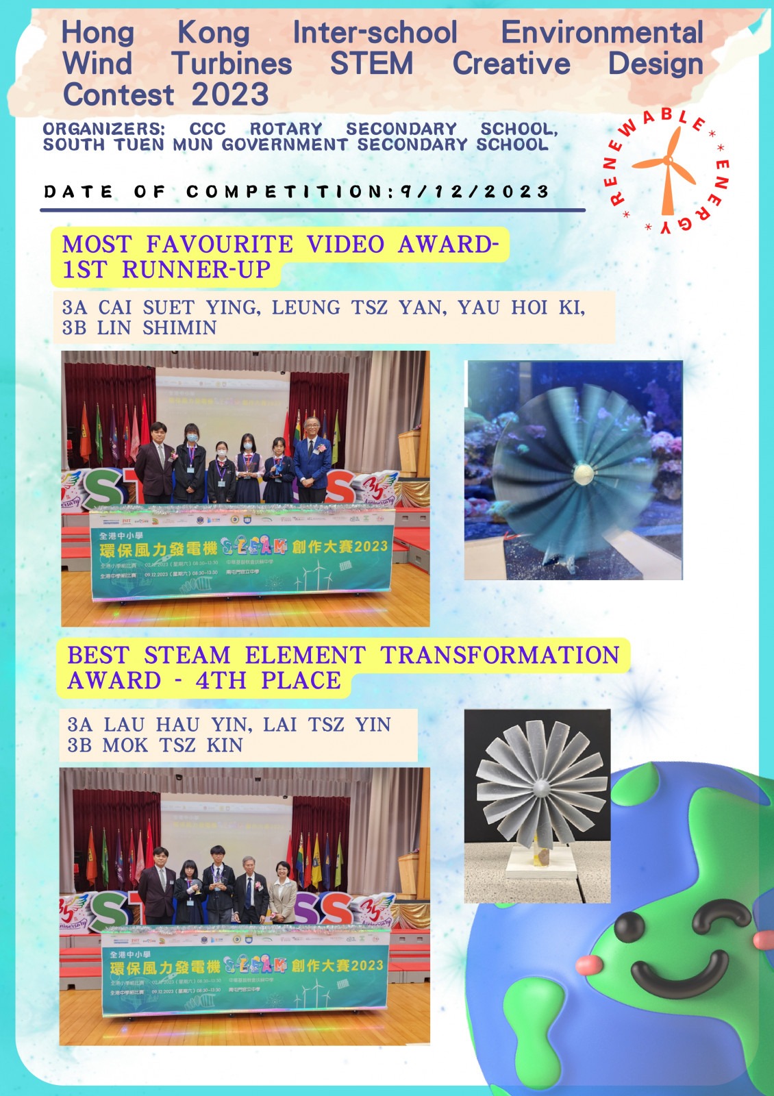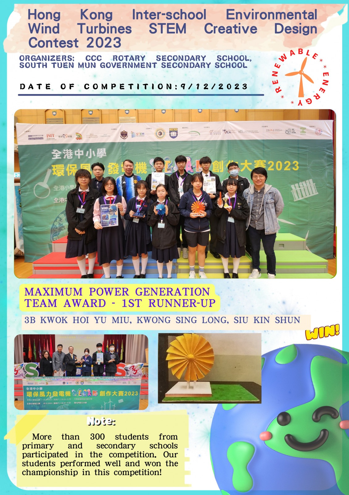 Inter-Team Maximum Power Generation Award (1st runner-up) and the Favorite Segment Award (1st runner-up) in Hong Kong Inter-school Environmental Win Turbines STEM Creative Design Contest 2023