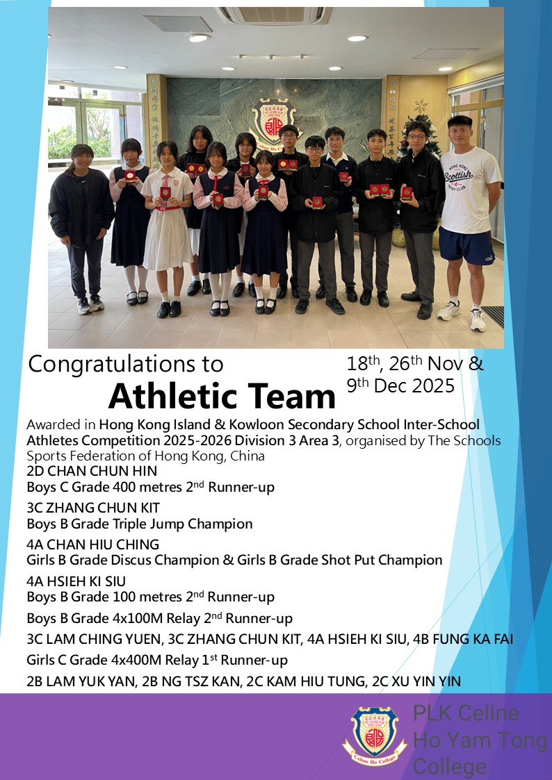Champion, 1st runner-up & 2nd runner-up in Hong Kong Island & Kowloon Secondary Schiool Inter-school Athletes Competition 2025-2026 Division 3 Area 3