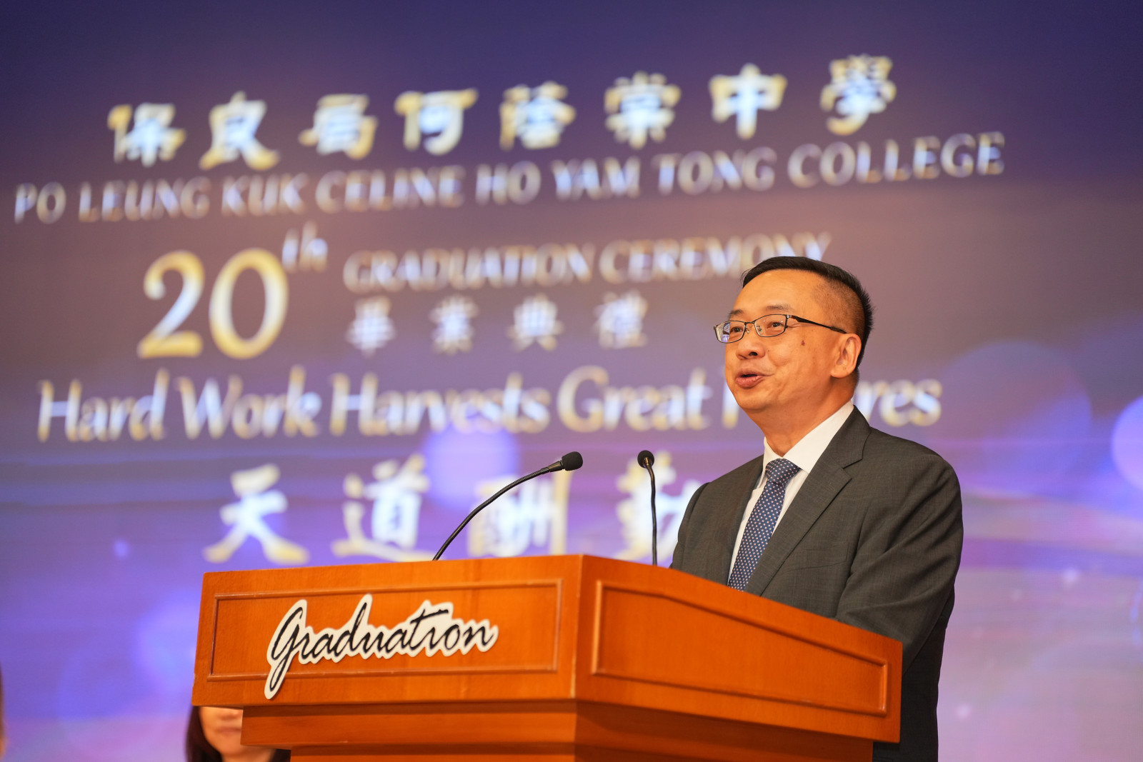 In his speech, Mr. KWOK Joon Fung, Benson, IDSM, Director of Immigration, shared his own experiences to encourage the graduates. He emphasized that everyone will encounter difficulties in life, but with double the effort and a positive attitude, one can overcome challenges and achieve their dreams. His words greatly benefited the graduates and will be valuable for them throughout their lives.