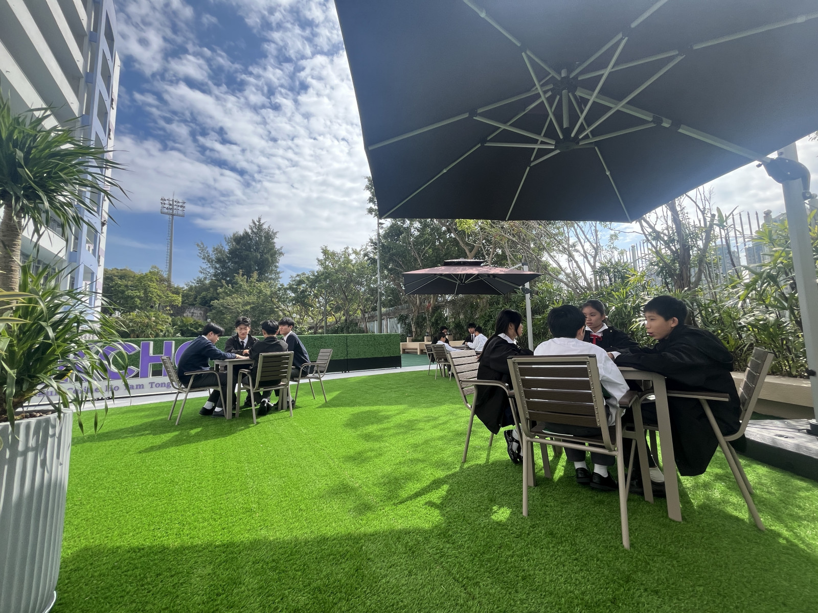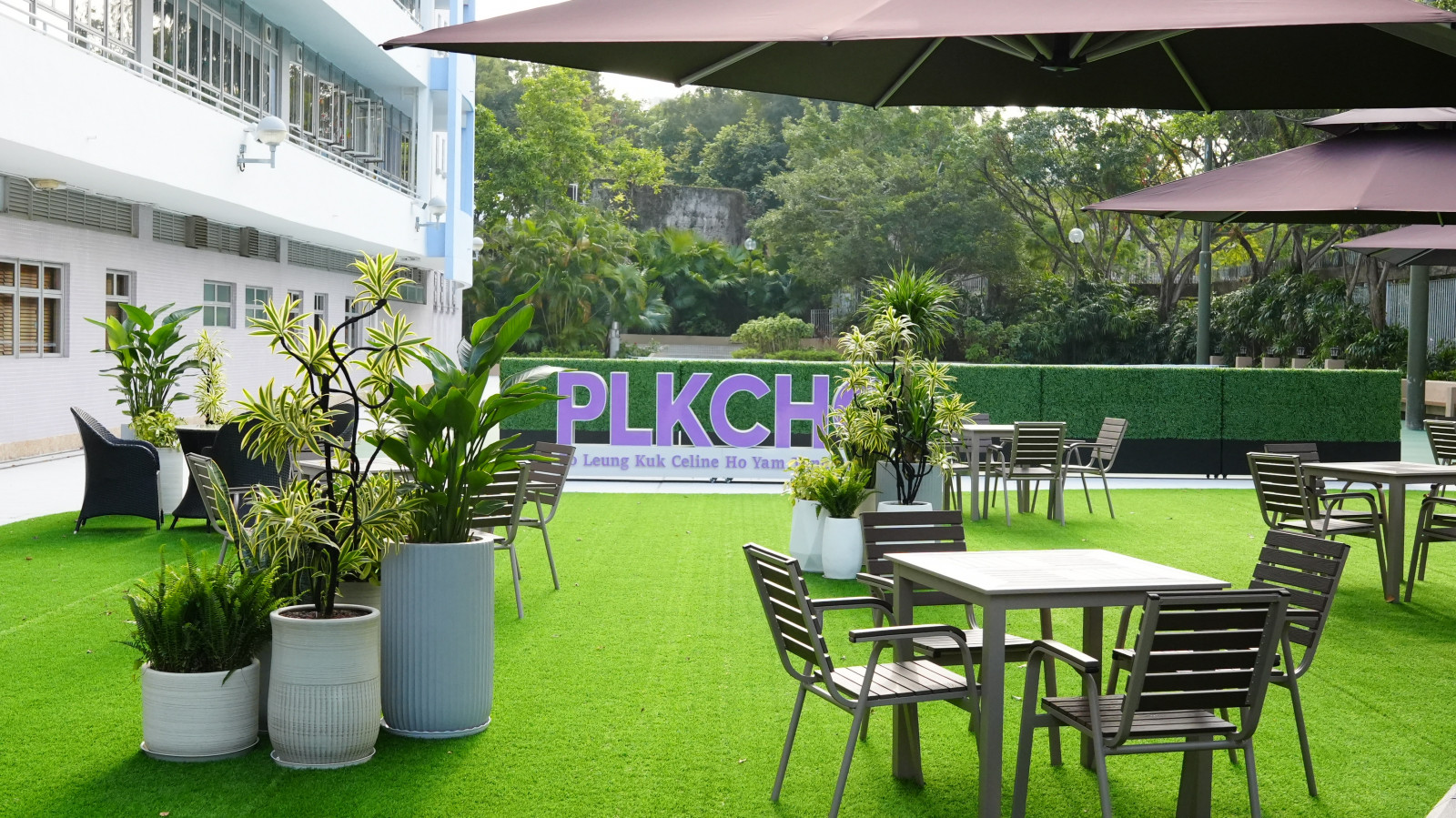 The comfortable and tranquil Celine Garden, with its breathtaking scenery, officially opens today! The garden features artificial grass and various areas for relaxation, and is equipped with multiple outdoor tables, chairs, rattan seats, and patio umbrellas, providing students with a great place to relax, study, and gather with friends.