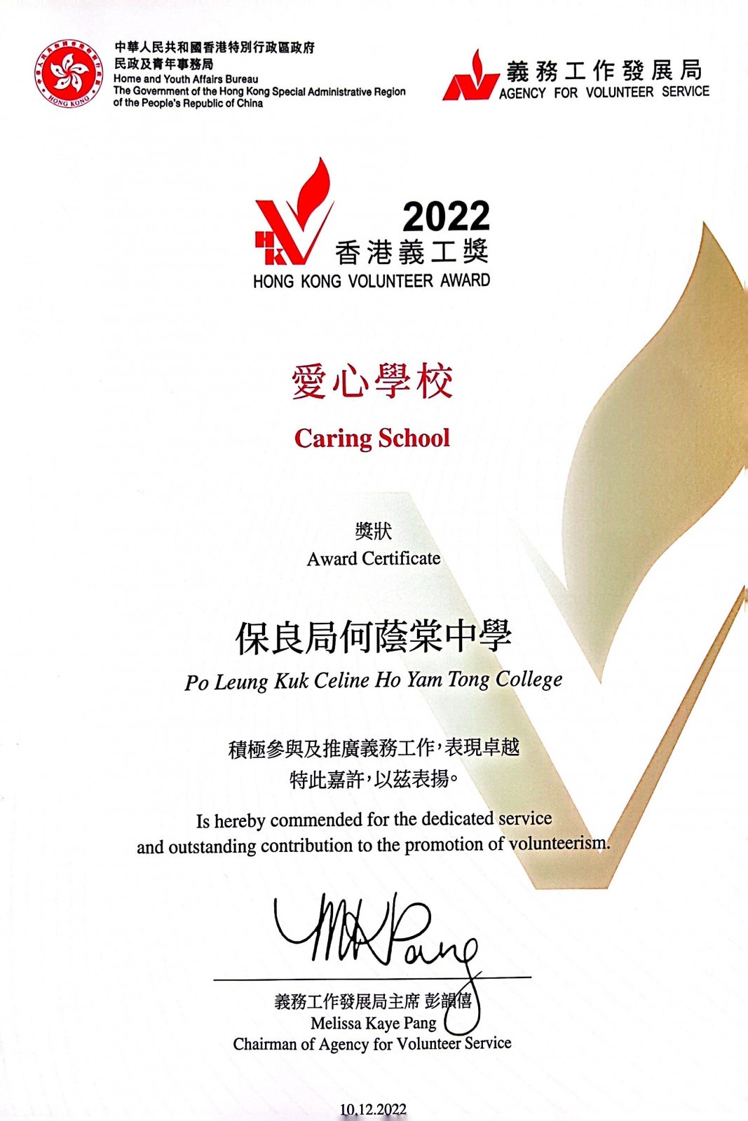 The College was awarded ‘Hong Kong Volunteer Award 2022’ co-organised by Home and Youth Affairs Bureau and Agency for Volunteer Service to commend students’ active participation in volunteering work and their contribution to society.