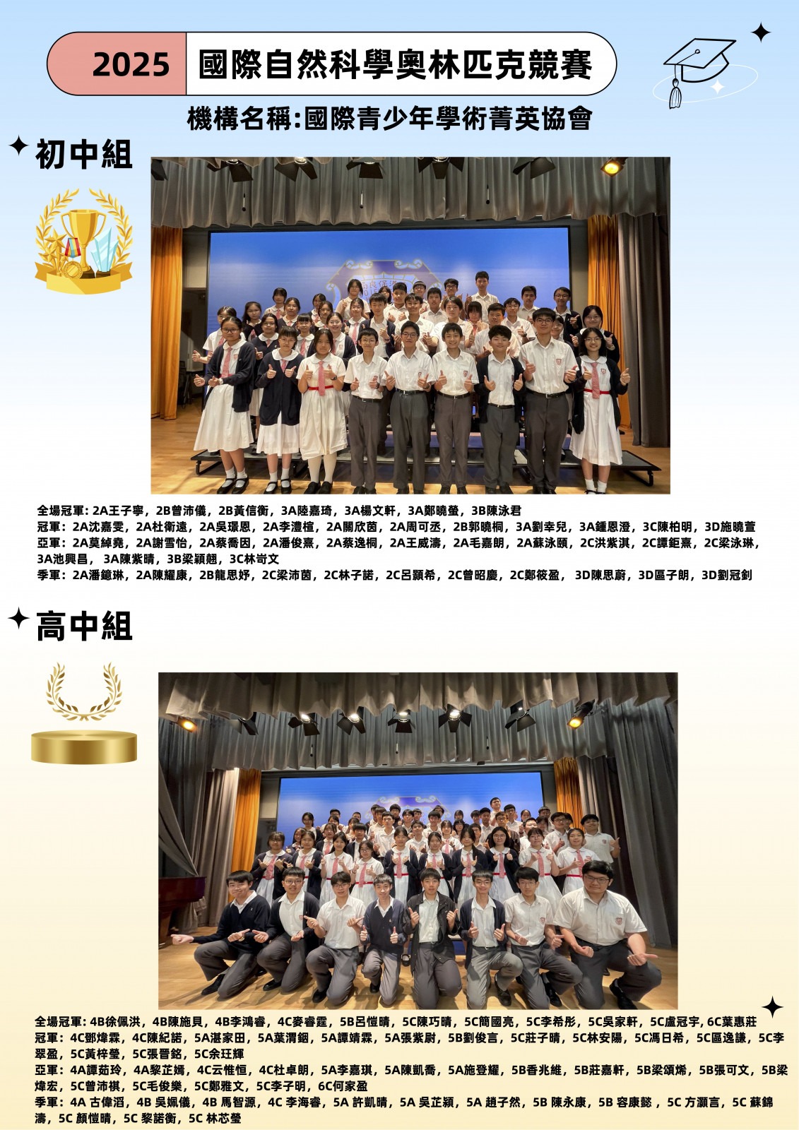 本校學生參加由國際青少年學術菁英協會主辦的「2025國際自然科學奧林匹克競賽」,在來自全球逾700名參賽者中脫穎而出,表現卓越,勇奪全場總冠軍及多個獎項。