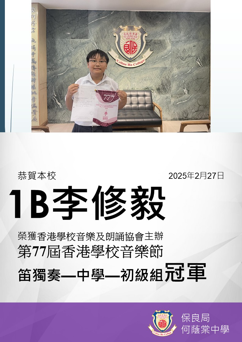 第77屆香港學校音樂節—笛獨奏中學初級組冠軍