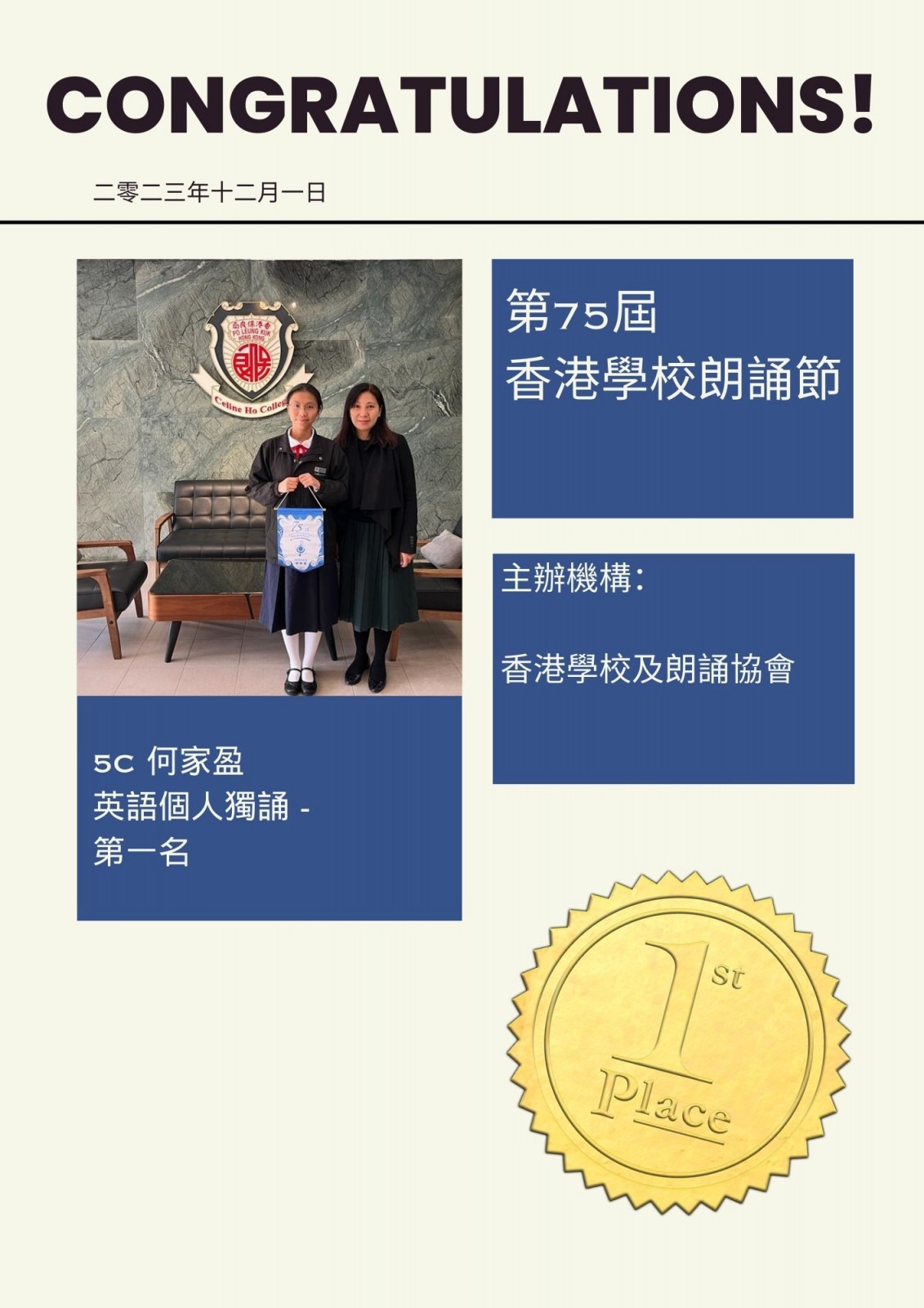 第七十五屆香港學校朗誦節 - 英語獨誦第一名