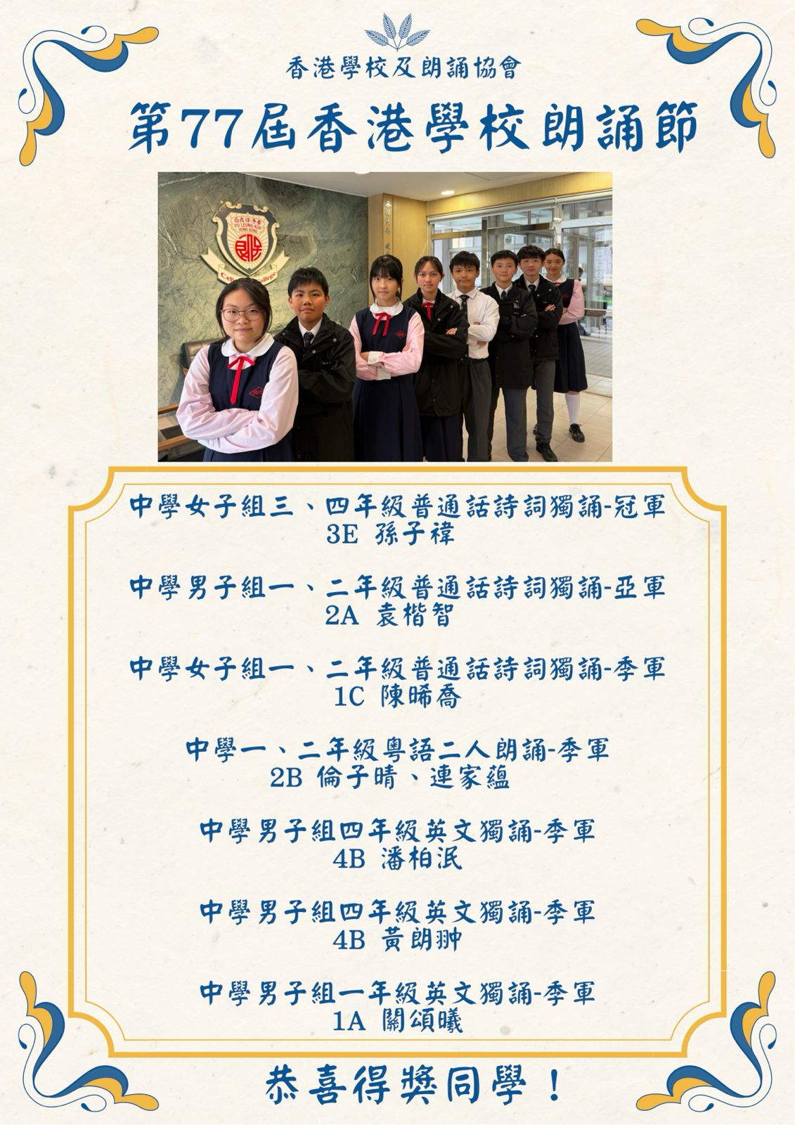 第七十七屆香港學校朗誦節 - 冠軍及多個獎項