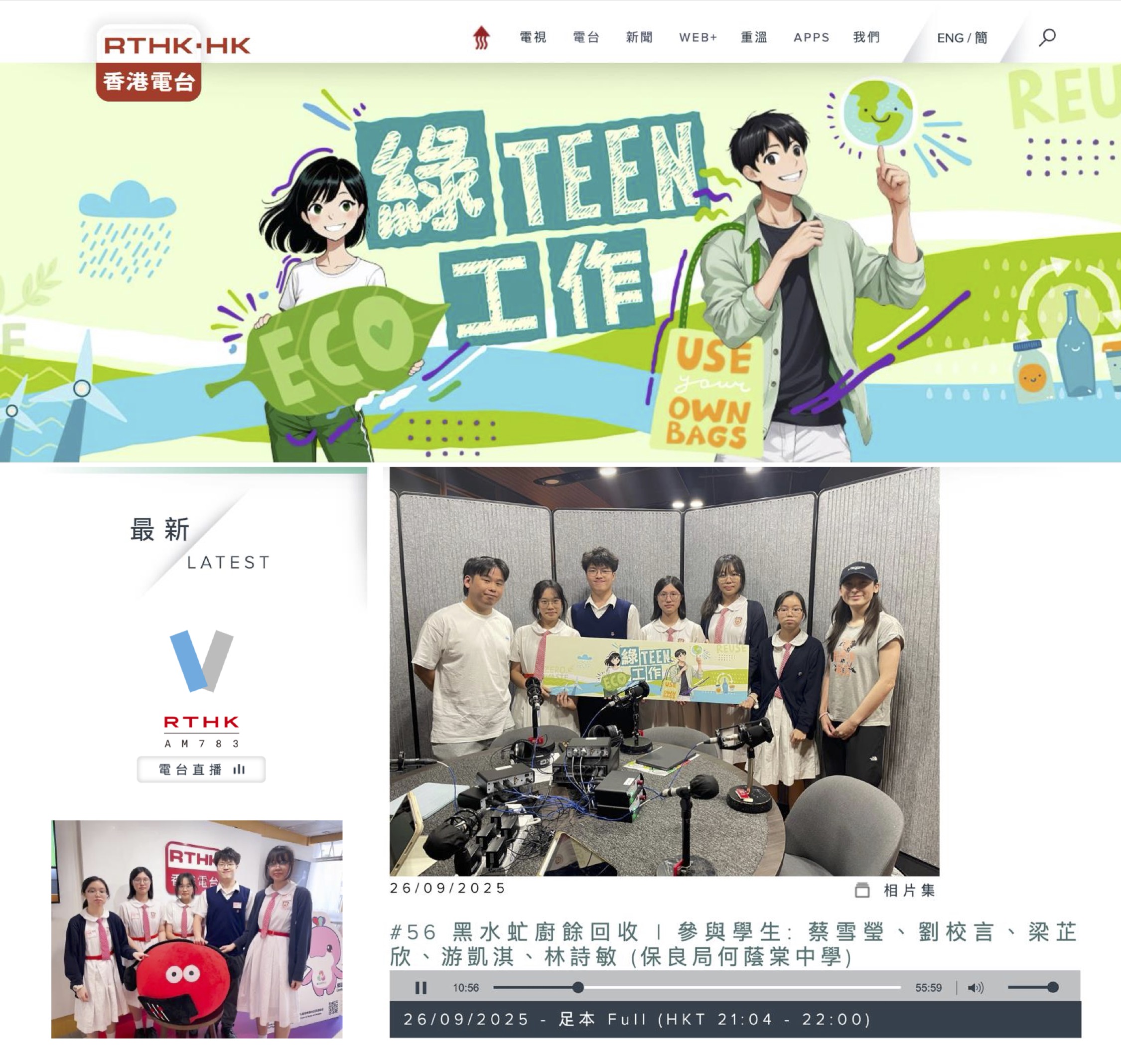 本校學生憑藉在環境科研領域的卓越表現,獲香港電台第五台節目《綠TEEN工作》專訪,分享參與香港中文大學育養珊瑚校園計劃及黑水虻廚餘回收再利用計劃的研究成果。